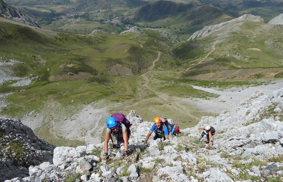 Llegamos al puntu de reunión.Entama la zona de trepaes.Hai muncha piedra suelta.Tenemos que dir xuntos.Tirar una piedra y mancar a alguien,ye posible.Pa minimizar el riesgu,lo meyor ye xubir xuntos.